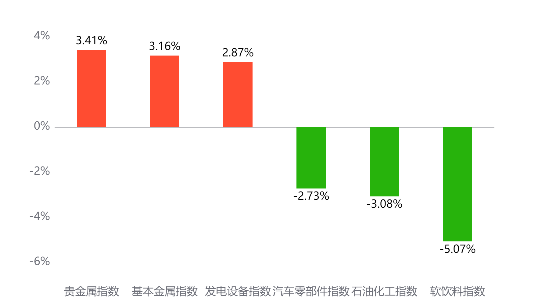 今天表现最好的主题概念依次为贵金属、基本金属、发电设备,表现最差的依次为汽车零部件、石油化工、软饮料。