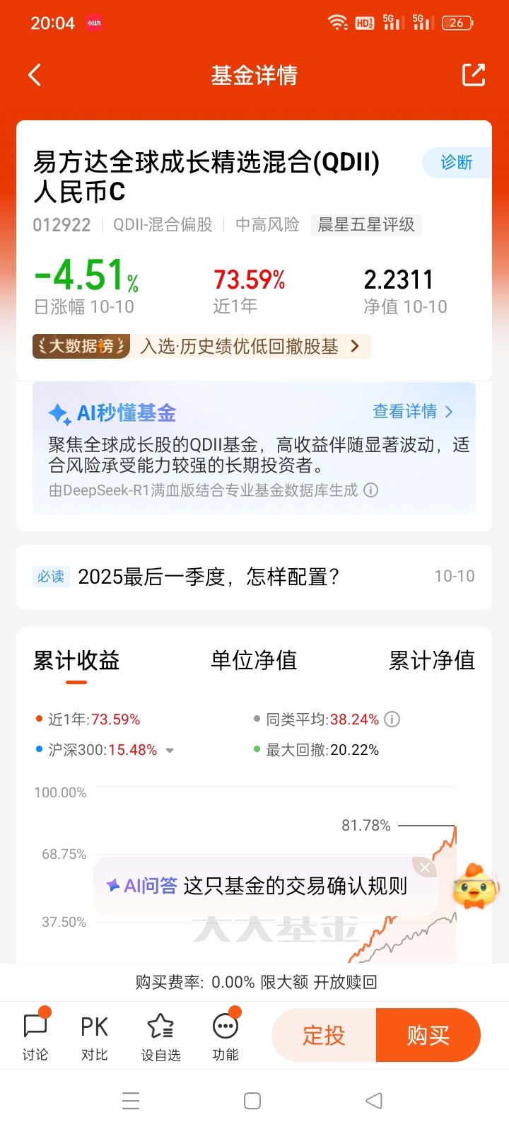今天市场就跌出个“黄金坑”,我会逢市场恐慌低吸筹码,乐观时控仓,用“核心 + 卫星”策略应对高波动。希望大家都能达到预期收益。@易方达基金