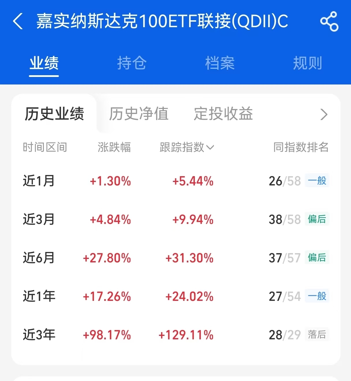 这个时候,$嘉实纳斯达克100ETF联接(QDII)C$ 调整了限购,现在单日最高能买5000元,给想进场的人更灵活的机会,符合大家多方面配置资产的需求。从长期业绩来看,嘉实近6个月收益率27.80%,近一年收益率17.26%。美股长期看好,纳斯达克主要布局科技、医疗这些研发投入多、不容易被超越的领域,要是关税真能一直缓和,企业在海外的压力会小不少,加上美联储可能调整货币政策,美股长期上涨的趋势有望稳住。