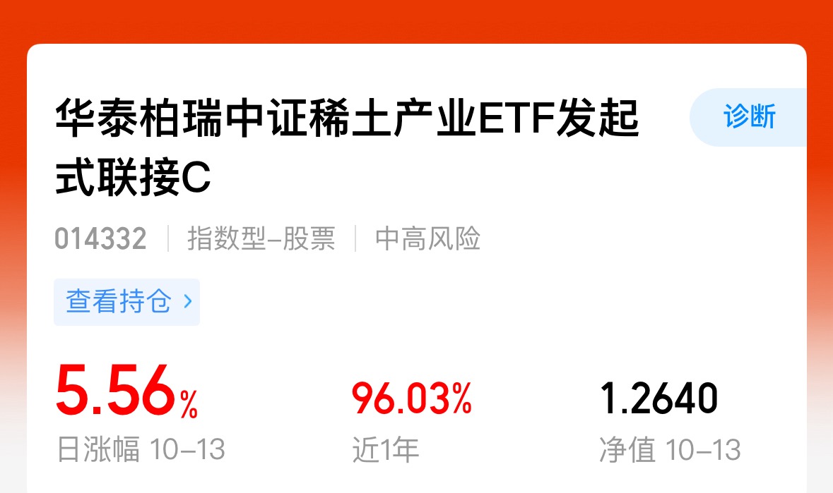 稀土板块今天继续狂飙!$华泰柏瑞中证稀土产业ETF发起式联接C$ 暴涨5.56%,近三个月涨超45%,一年收益78.16%!战略资源价值重估,这涨幅太解气了!