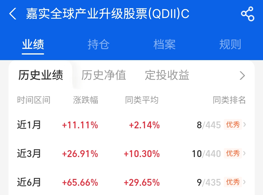 $嘉实全球产业升级股票发起式(QDII)C$ 重仓高通、英伟达这些全球科技领军企业,近半年直接涨了65.66%,收益看得人眼馋。科技浪潮要长期布局的,稳稳拿住就能吃红利。