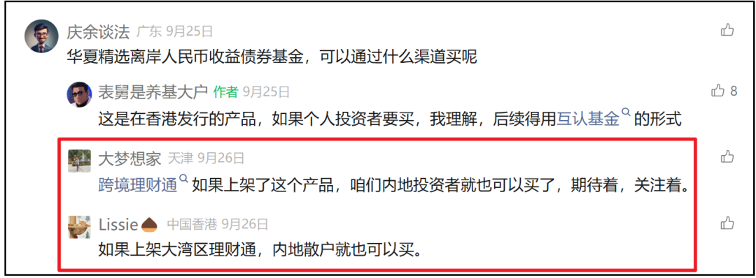 不过,补充一下,我之前的一个说法不对,上面提到的华夏香港发行的主投点心债的产品,即使没有互认基金,通过跨境理财通,后续大家也能买,之前评论区有小伙伴指正,正好想起来了,趁此机会补充一下。