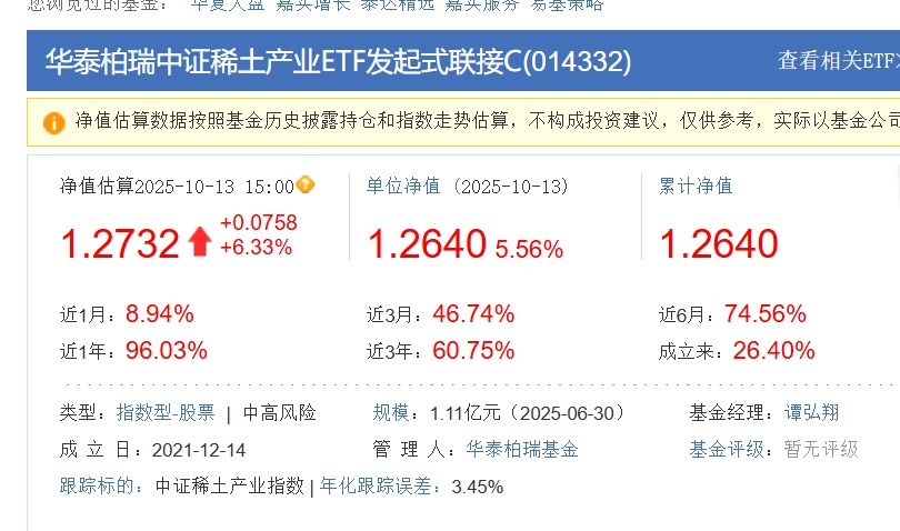 今天打开理财软件被震撼到了!华泰中证稀土一天涨5.56%,三个月45%+,一年收益78%!关税反制推动战略地位提升,这行情太火爆了!