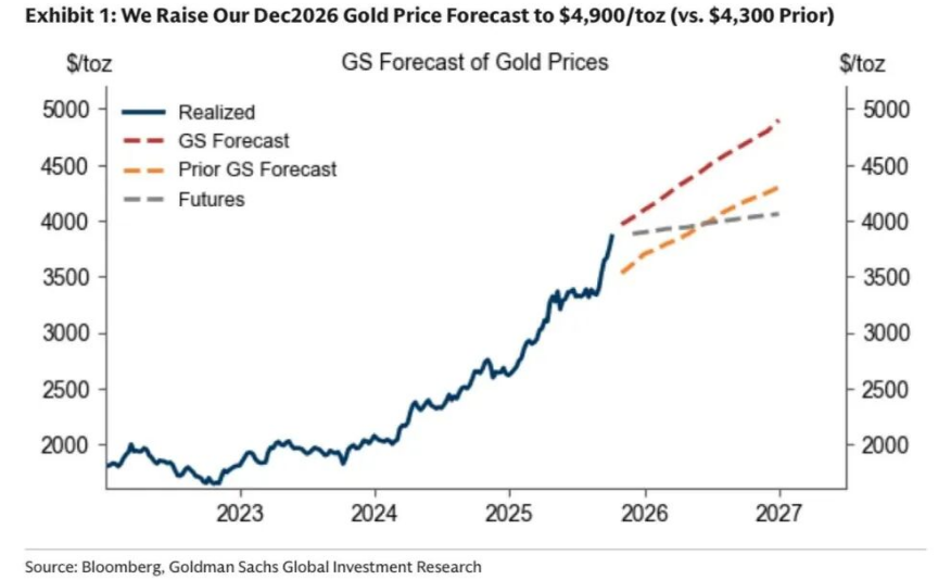 接着上一篇说,黄金在特总制造的混乱中又续上一口。高盛已经将2026年12月的金价预测上调至4900美元/盎司,加了23%的上涨空间。