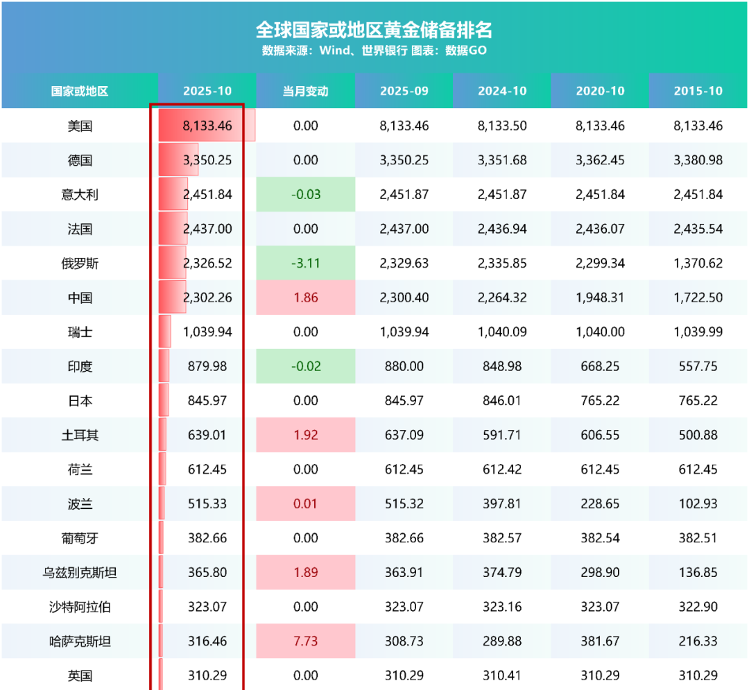 尤其是,截至2025年9月,我国黄金占外汇储备总量只有7.7%,远低于国际平均的15+%,绝对数量上还不如德国、法国、意大利。篇幅原因只截了一部分,图源见图片标题。