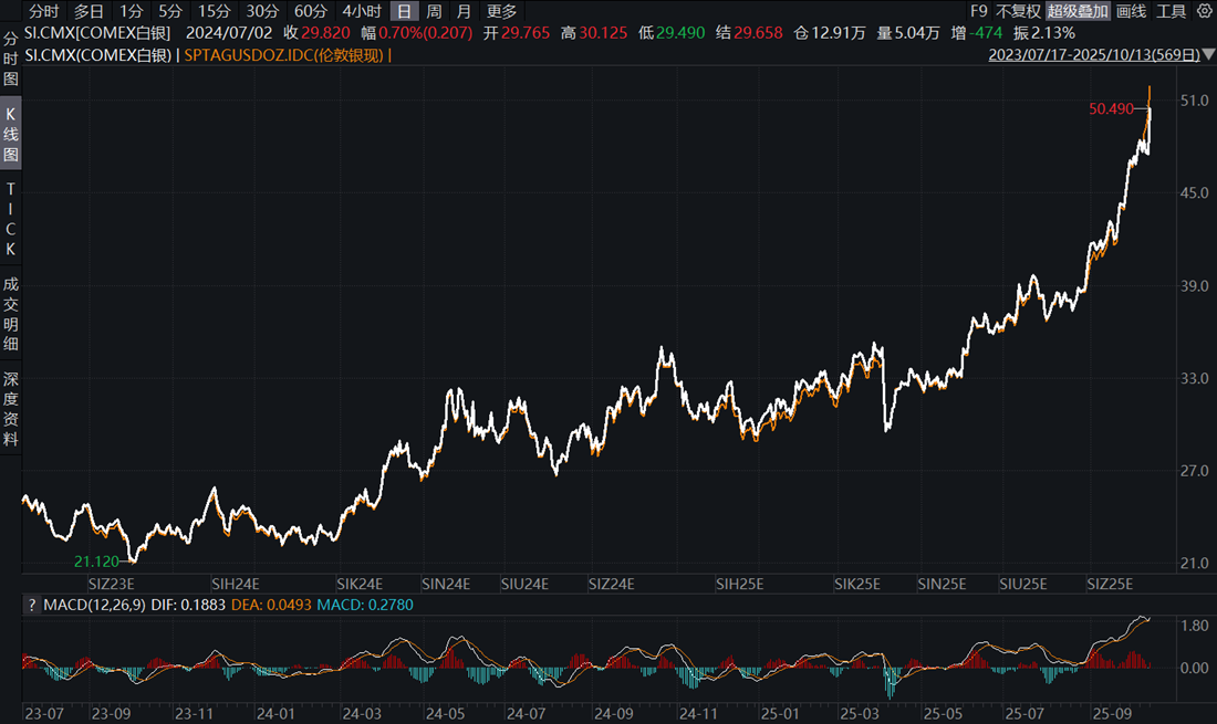 但白银从10月6号开始,现货开始反超期货,最大差异出现在10月10号,收盘贴水高达2.6美元/盎司。主要原因就是现货紧张,也就是之前评论区朋友说的,“逼仓导致断货”,然后加价。这么大的期现差异肯定是不可持续,于是今天(周一)COMEX银暴涨,盘中一度超过7%。