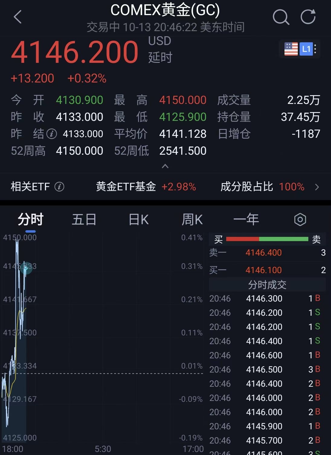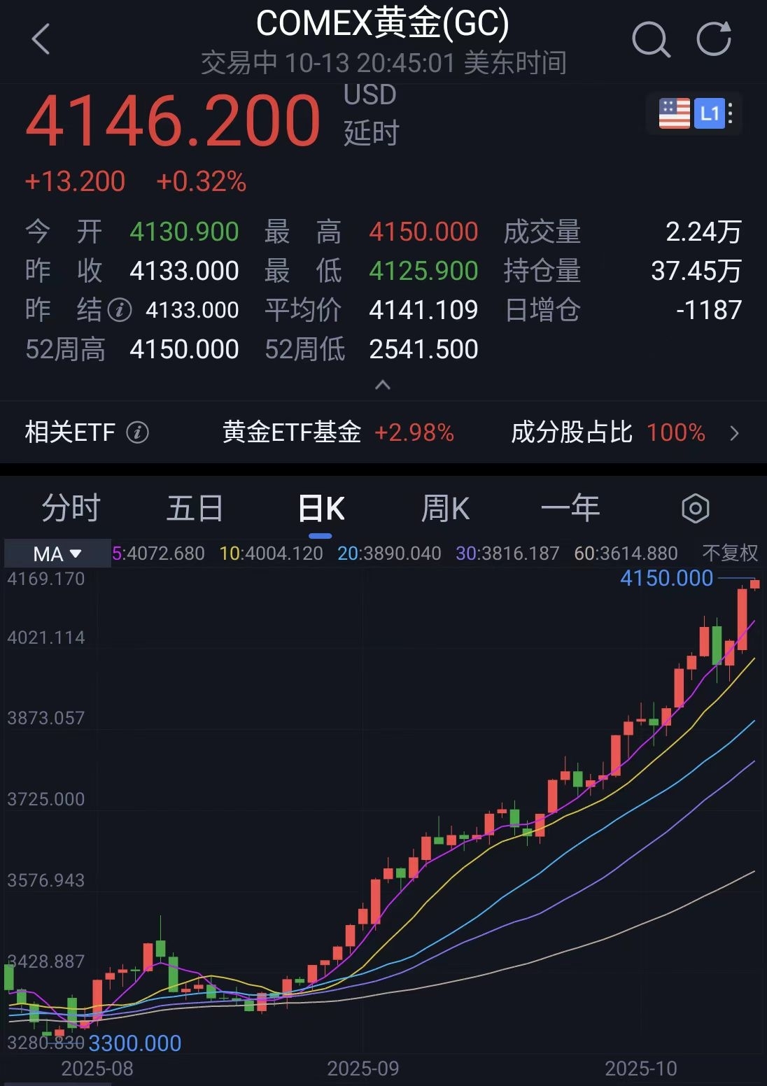 黄金盘中再创新高,4150美元!