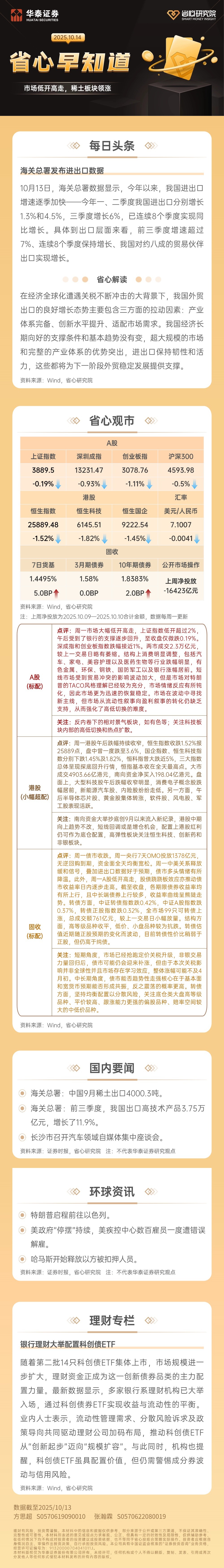 周一市场大幅低开高走,上证指数低开超过2%,午后受到了银行的支撑逐步回升,至收盘仅微跌0.19%。深成指和创业板指数跌幅接近1%。两市成交2.3万亿元,较上一交易日略有萎缩。结构上消费明显调整,包括汽车、家电、美容护理以及医药生物等行业跌幅明显,有色金属、环保、钢铁、国防军工以及银行涨幅居前。短线市场受到贸易冲突的影响波动加大,但是市场对特朗普的TACO风格理解已经较为充分,市场情绪反应有所钝化,因此市场更为迅速的恢复稳定。市场在波动中寻找新主线,但市场从流动性叙事向盈利叙事的转化仍缺乏支持,从而强化了高低切换的难度。