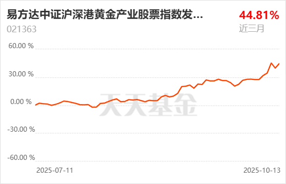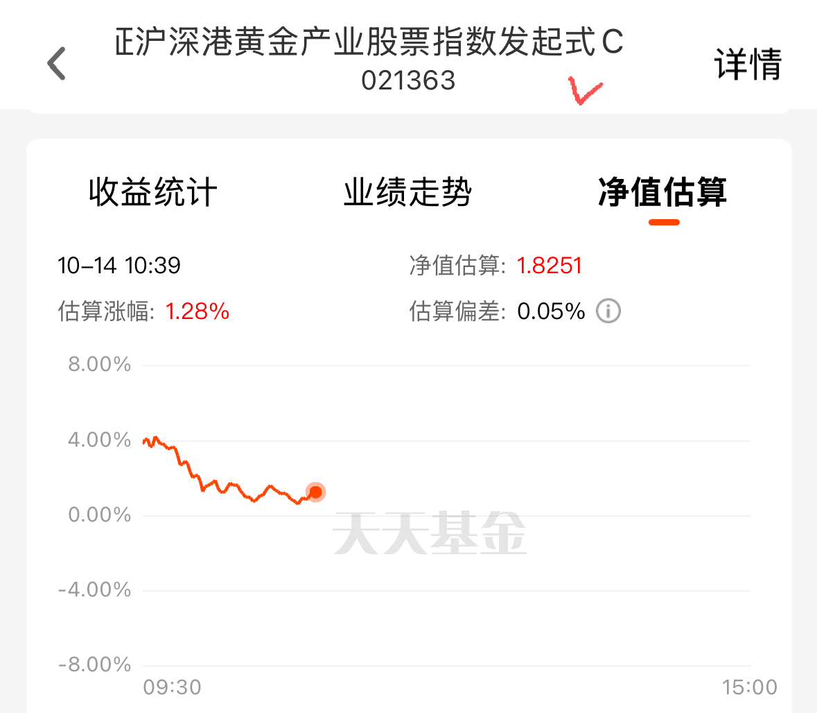 到现在A股港股都跳水了,唯一坚挺的就是黄金了!现货黄金突破4100,红的人头皮发麻,老美政府停摆,美联储降息周期打开,黄金我认为还在强势周期。今天加的$易方达中证沪深港黄金产业股票指数发起式C(OTCFUND|021363)$是黄金股基金,区别于黄金基,上涨弹性更大,近一周7.75%,近一月13.27%,短期的业绩是非常优秀的。现在估值涨1%多,继续持有!