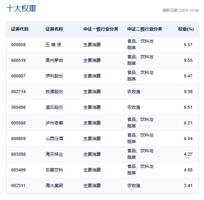 中证主要消费指数作为消费大板块中的刚需、内需属性板块,具有明显的穿越经济周期的盈利韧性。前十大成分股权重占比超68%,其中4只白酒龙头股共占比31%,养猪大户占比16%。