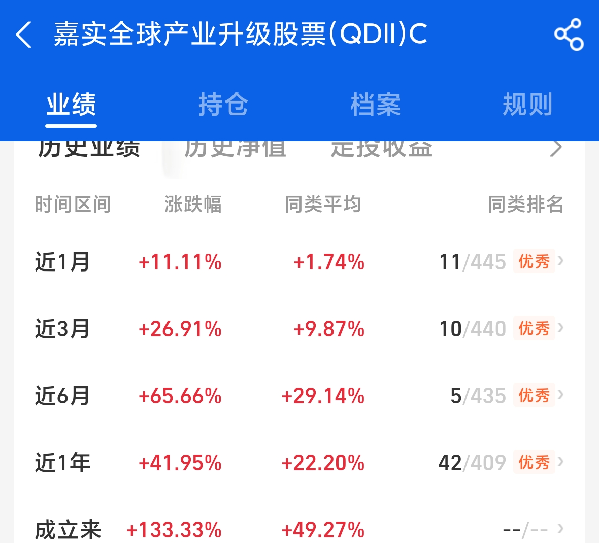 #稀土价格暴涨37%!稀土板块狂飙# #券商把脉:冲击小于4月 黄金坑再现?# #指数操盘手集结令# #全球市场深夜暴跌!纳指重挫超3%# 随着中美关系缓和,美股进行修复,科技板块也是大涨,半导体板块不论是国外还是国内都是主线位置,昨天姚姚说的黄金坑也是说对了$嘉实全球产业升级股票发起式(QDII)C$ 该基金主要聚焦美股半导体领域,还有大约30%的A股和港股芯片资产,注重资源领域投资,所以咱们不用担心业绩!