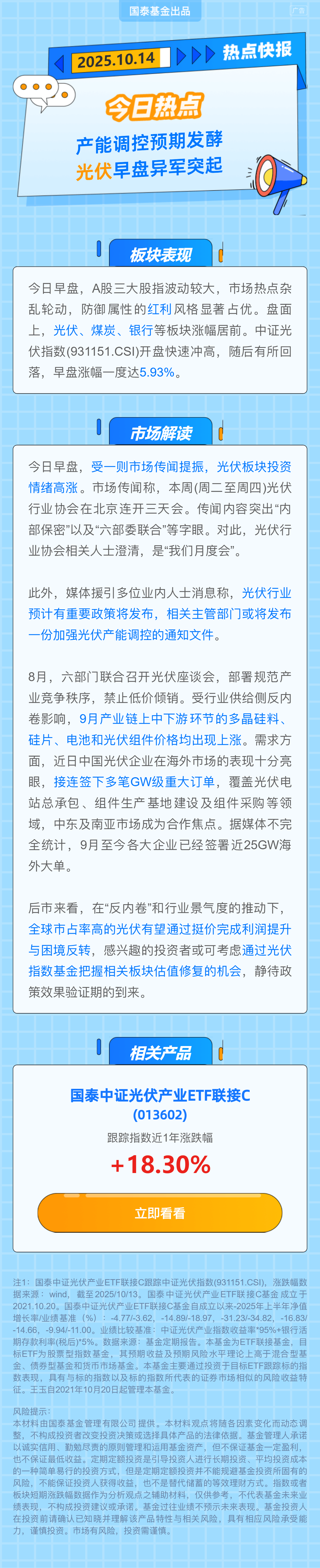 $国泰中证光伏产业ETF发起联接A(OTCFUND|013601)$$国泰中证光伏产业ETF发起联接C(OTCFUND|013602)$$国泰中证光伏产业ETF发起联接E(OTCFUND|021698)$