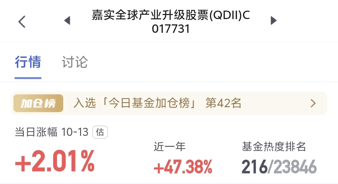 10月14日大A震荡不停,美股市场反而挺稳健,刚回调一天就迎来了反弹行情。$嘉实全球产业升级股票发起式(QDII)C$ 今天估值2.01%,近一年上涨47.38%,整体表现很不错。重点是它既包含大A科技股,又覆盖美股科技标的,能吃到东西方双重红利,我非常看好它的后续发展。