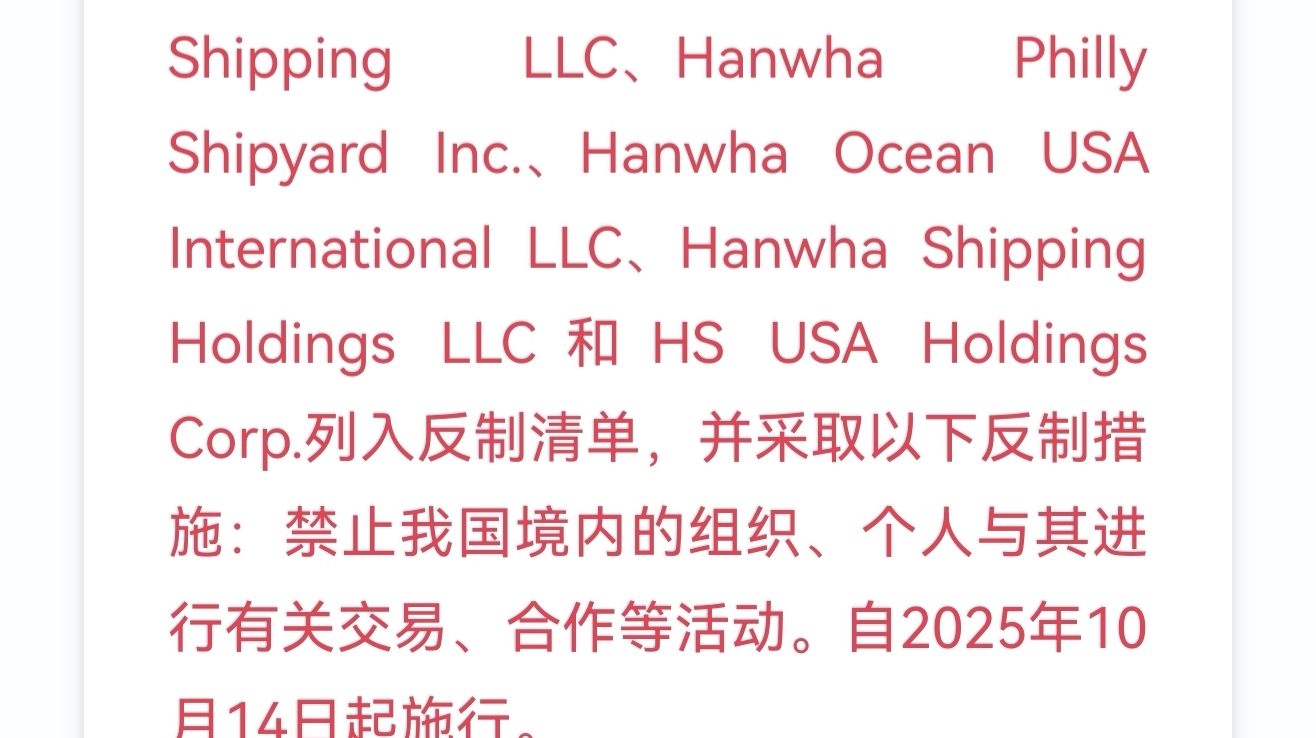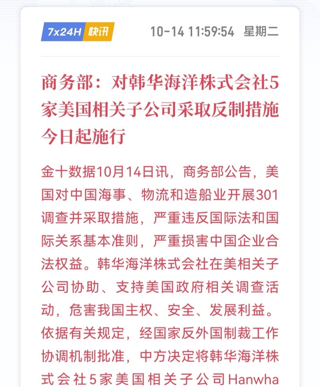 商务部:对韩华海洋株式会社5家美国相关子公司采取反制措施今日起施行