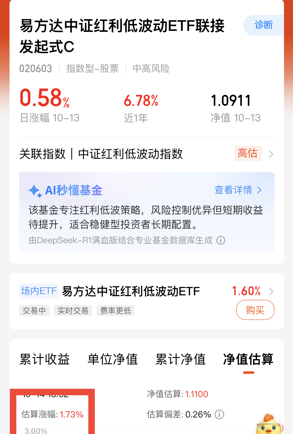 今天煤炭、银行等传统红利资产集体普涨,而科技板块震荡在加剧,市场开始出现“高切低”的分歧信号。为了让持仓攻守平衡,我加仓了$易方达中证红利低波动ETF联接发起式C(OTCFUND|020603)$。这只基金聚焦红利低波资产,正好契合当前防御需求——红利股本身股息稳定,叠加低波动属性,能对冲科技板块的波动风险。眼下行情分化,配点红利类资产,既能跟上传统板块的涨势,也能给持仓加层安全垫。