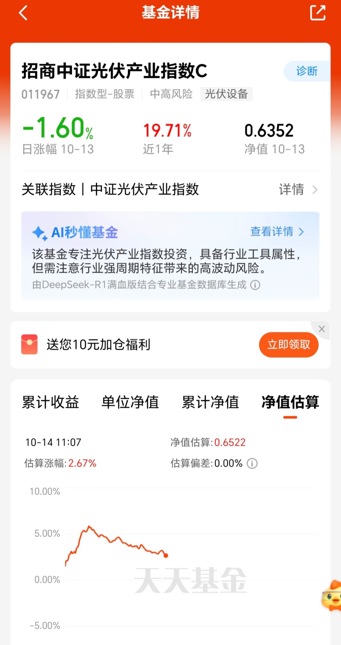 今日市场光伏开盘率先领涨力度高达4%,行情再度回归!而从政策面来看,核心是“市场化”+“消纳”,简单来说就是光伏板得配储能,发的电存起来再用,这样才不会浪费,同时当下资金也在主动买入,不少企业都在埋伏布局,我也准备跟上节奏,加仓$招商中证光伏产业指数C(OTCFUND|011967)$这款基金聚焦于光伏产业核心领域,当前正处于较低估值水平,因为安全边际很高,所以有望迎来快速修复反弹,我也准备慢慢定投起来,期待后期迎来惊喜收获!