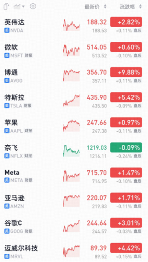 【重仓涨跌】昨日华宝纳斯达克精选前十大重仓股9涨1跌,美元兑人民币中间价↓0.06%。(重仓股涨跌情况仅供参考,不代表当前基金业绩表现,还请以每日更新的实际基金净值为准)