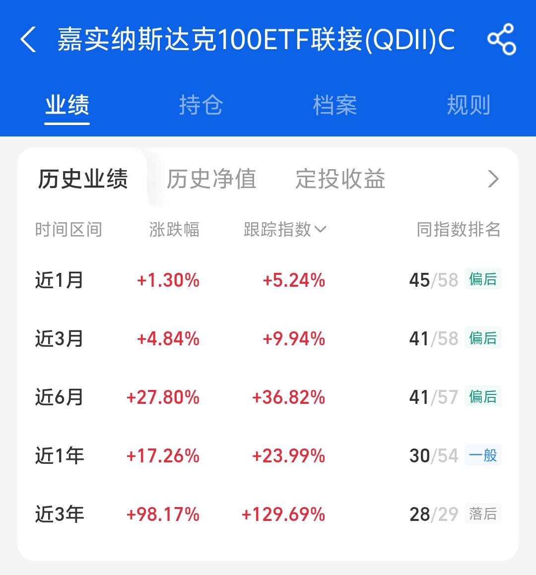 偶然了解到$嘉实纳斯达克100ETF发起联接(QDII)C人民币$ ,觉得挺适合自己这种想省心的。不用纠结选哪家公司,跟着指数走,相当于间接参与到这些全球领先企业的发展里,看着它们不断突破,心里也觉得踏实,希望后续能够有更好的表现,加油,奥利给