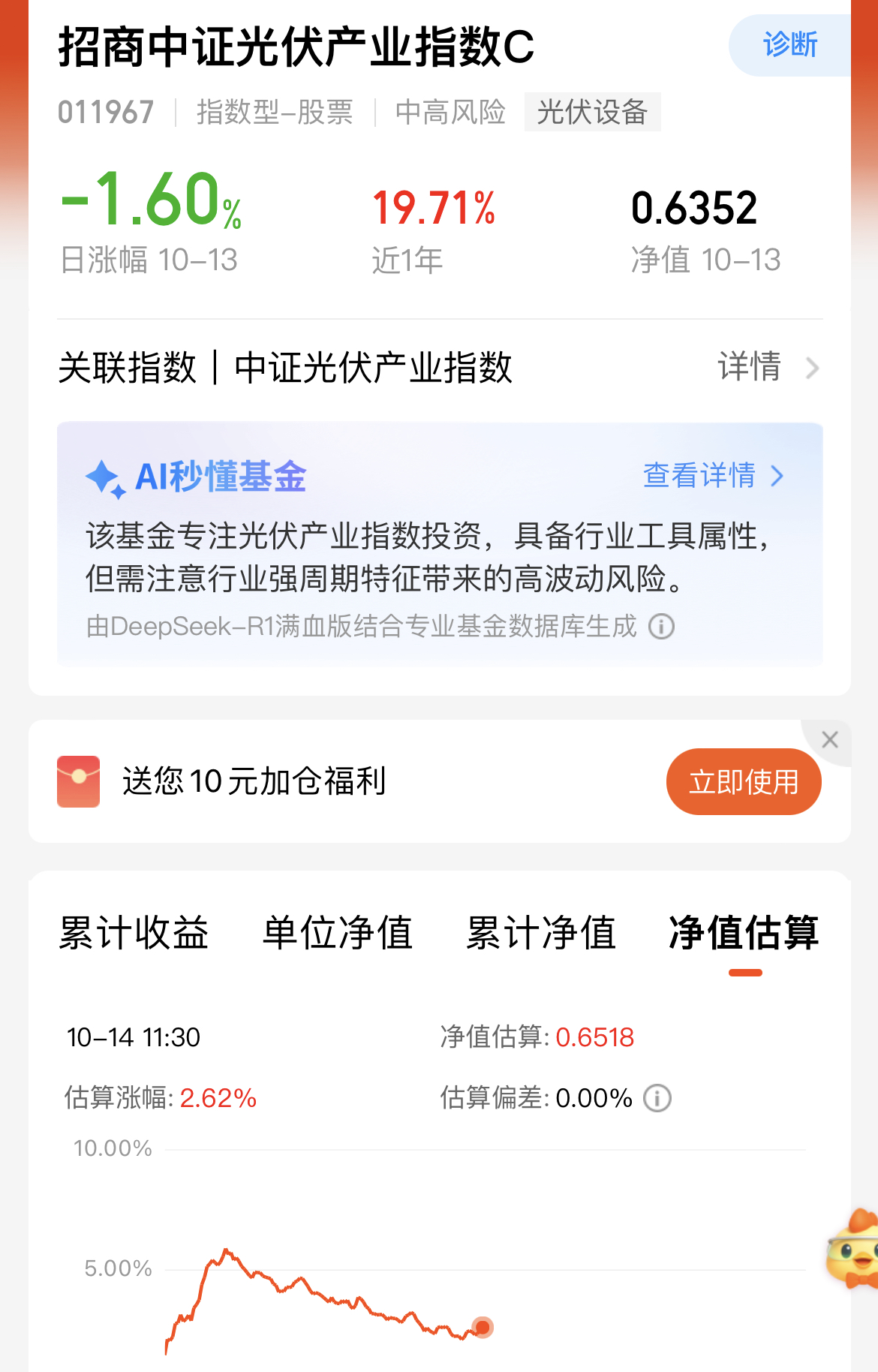 今天光伏指数早盘直接涨超5%,市场资金正主动买入光伏板块,我也打算跟着加仓$招商中证光伏产业指数C(OTCFUND|011967)$这只基金业绩很稳,近三个月涨26.13%、半年超40%,收益比较稳定。