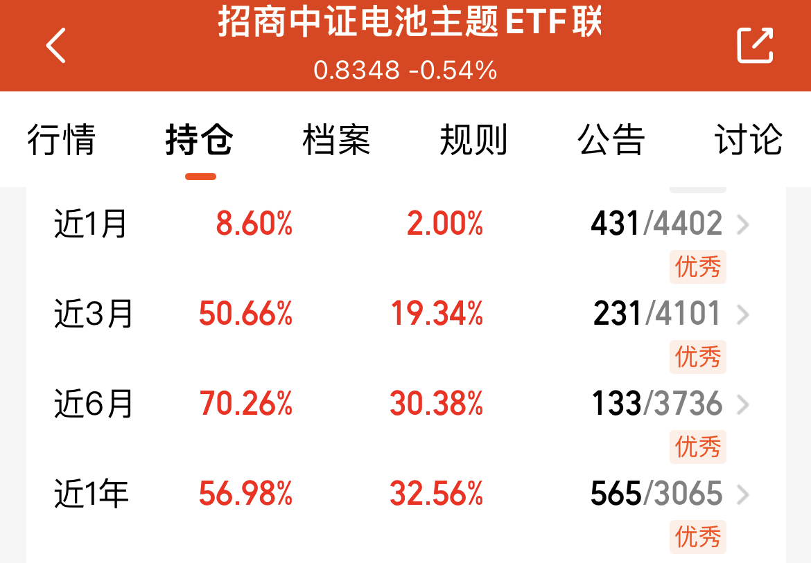 电池板块近期调整很正常,毕竟前期涨了不少,正好给了加仓机会,我打算趁这波调整入手$招商中证电池主题ETF联接C(OTCFUND|016020)$。这只基金业绩很亮眼,近三个月涨50.66%、半年涨70.26%,盈利能力很稳。