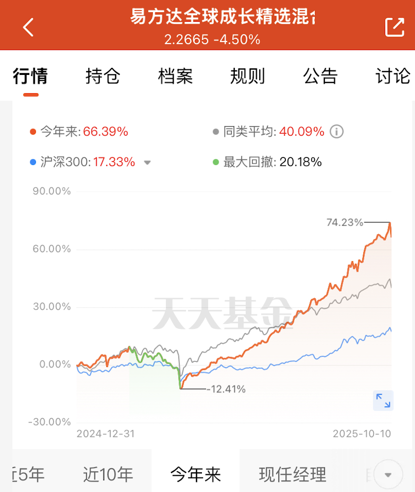 在此背景下,这只易方达全球成长精选混合(QDII)显示出极强的调仓与选股能力:年初精准重仓港股,捕捉估值修复行情;第二季度果断加仓美股,把握纳斯达克科技板块上涨;7-8月迅速切入CPO板块,踩准全球最热赛道。几乎每一波市场主线,这只基金都能牢牢把握,业绩稳居前列。近六个月累计涨幅近80%,短期表现同样抢眼,国庆期间更实现+2.8%,跑赢海外主要科技指数。