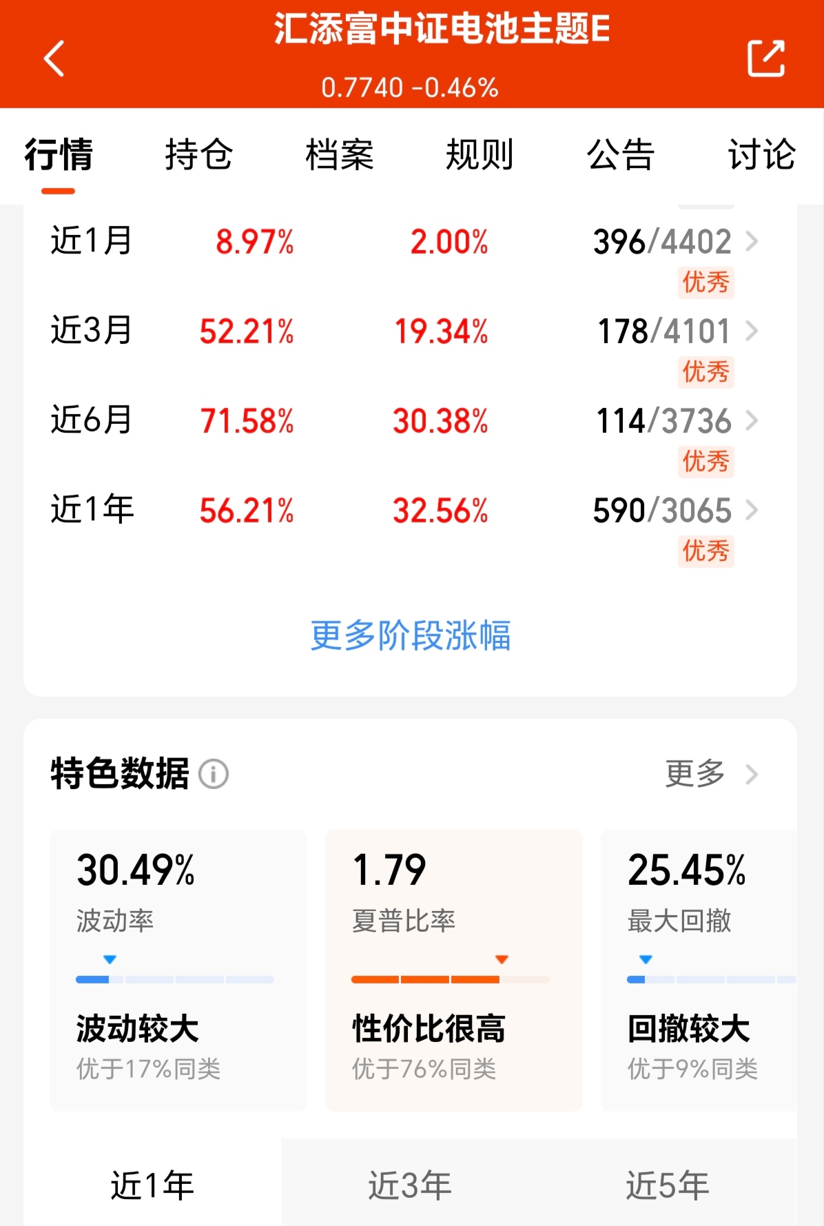 在短短三个月里,涨幅就高达52.21%,近6个月涨幅超71.58%,大幅度跑赢同类平均30.38%,各个阶段的业绩都排名优秀靠前,并且不仅业绩出色亮眼,它的综合费率还是同类最低的,这样持仓性价比也会更高,虽然近期有所回调,但在政策与技术的双轮驱动下,固态电池板块行情还并未走完,所以我准备继续加仓起来,相信长期持有必然会有不错收获的!