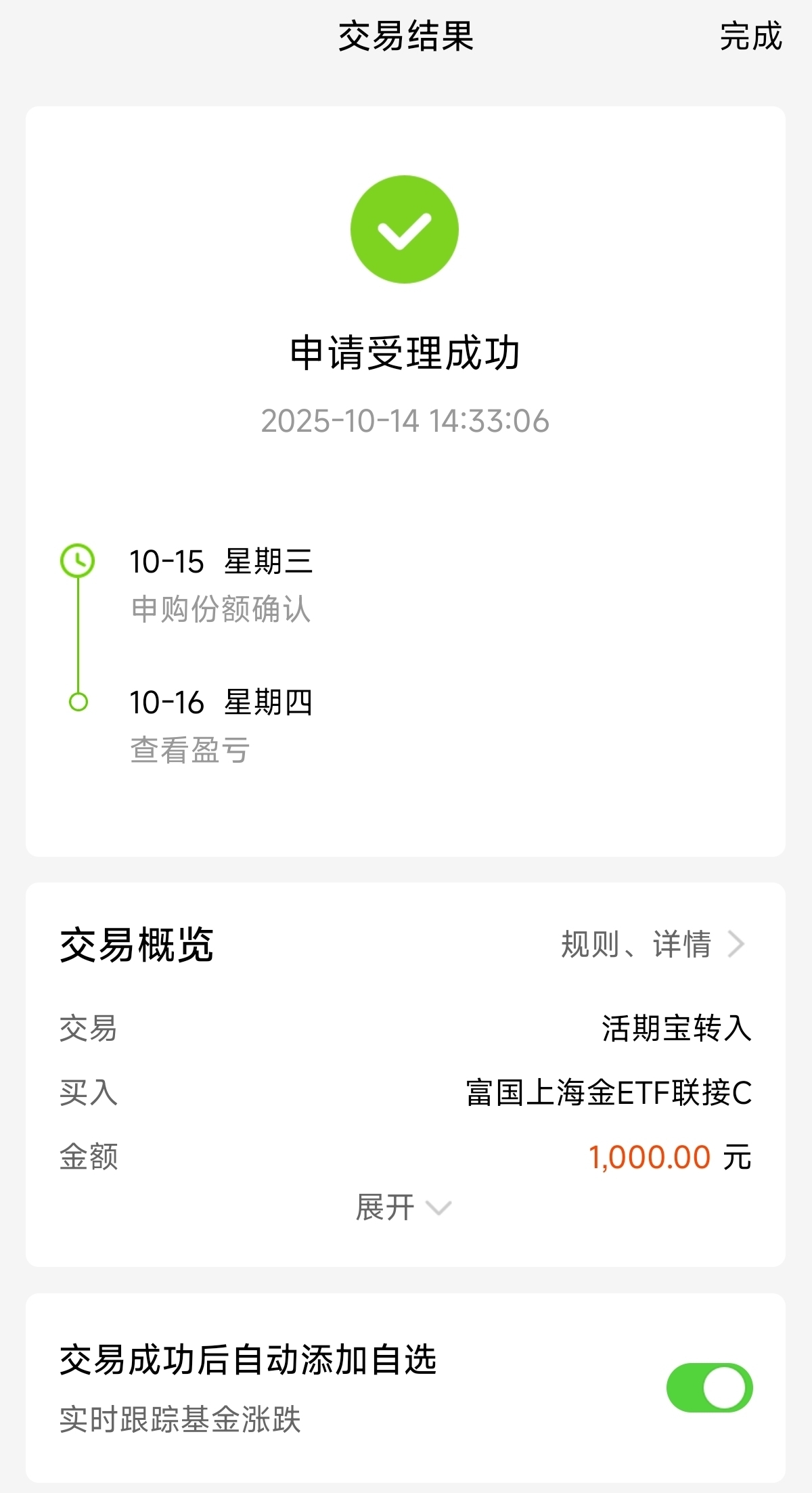 投资逻辑上,美国政府停摆与关税扰动再起,刺激了黄金避险需求。国盛证券指出:“在避险需求与流动性宽松双重因素加持下,黄金或将继续上涨。”场外投资者可以看看富国上海金ETF联接C(009505),先买入1000元,后续看情况再买。