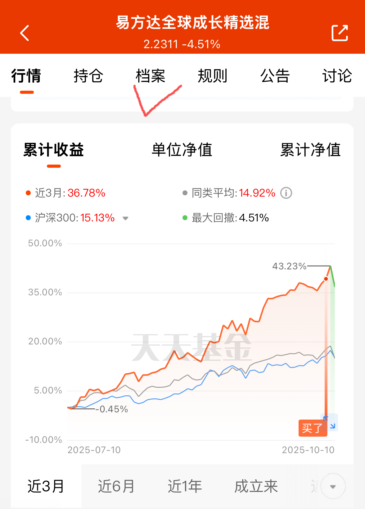 大家今天都买啥了?我,连续4个工作日加仓,连续4个工作日亏损,跌麻了,港股A股一起跌,要老命了。还是$易方达全球成长精选混合(QDII)人民币C(OTCFUND|012922)$抗震,近三月36.78%,同类平均才14.92%,跑赢沪深300也没问题。持仓策略是全球方向配置的,美联储降息周期开启,全球科技类资产有望受益,美股的AI有先发优势,A股部分资产在算力建设中有优势、港股的互联网巨头是最受益AI应用落地的,单独一个方向容易踏空,但是全球基的话,加上经理的择时能力,可以更好把握行情。