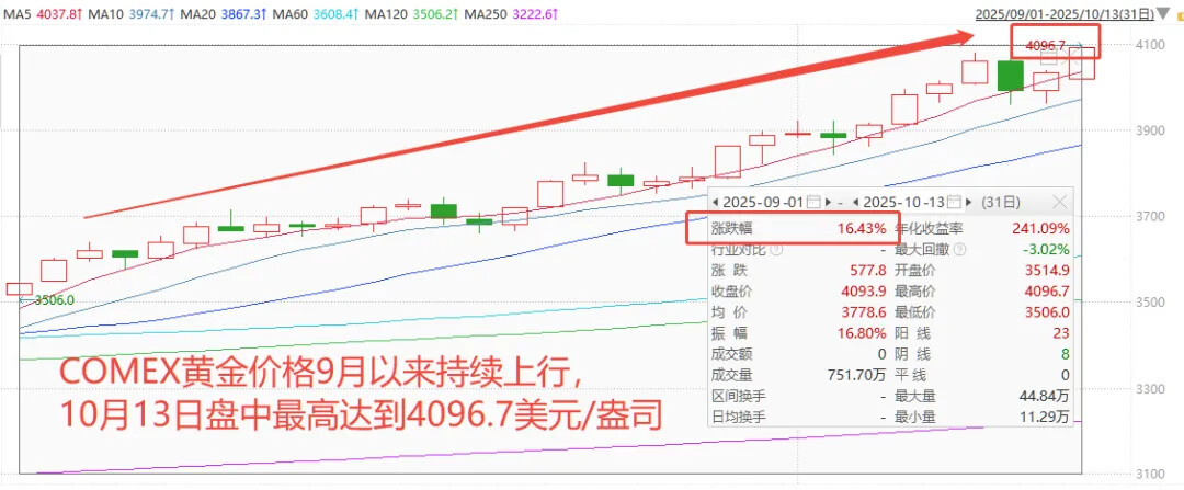 避险资金涌入黄金,推动COMEX黄金价格大涨,盘中最高至4096.7美元/盎司;