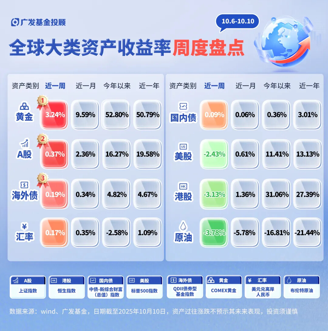 而另一边,国际市场上避险情绪明显升温。美国政府关门危机、日本法国政局混乱,再加上周末中美贸易摩擦再升级,一系列不确定性让大家的避险需求持续上升,于是黄金一举突破4000美元大关,单周大涨超过3%。