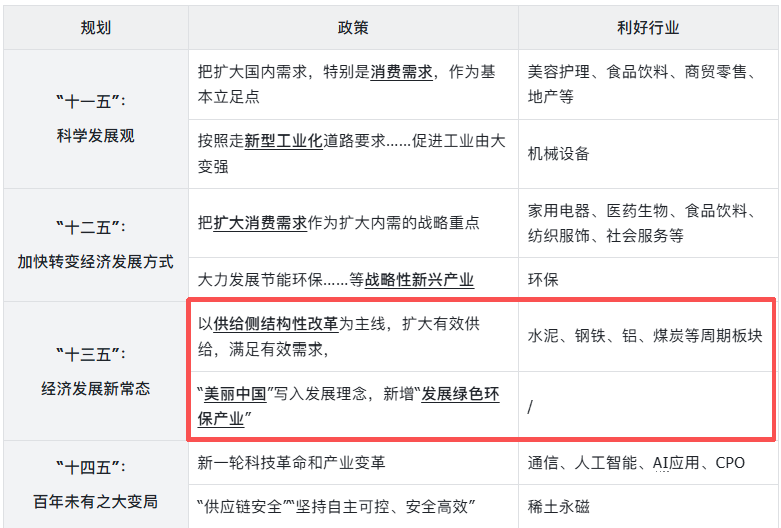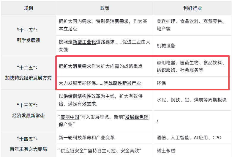 具体来看历次的五年规划,会发现不同的政策主线,直接决定了后续几年的行业轮动逻辑。