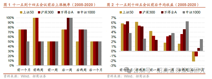 从整体规律来看,会议召开前两周,大盘指数上涨概率高达100%,而会议结束的后一周,小盘指数的表现更好。