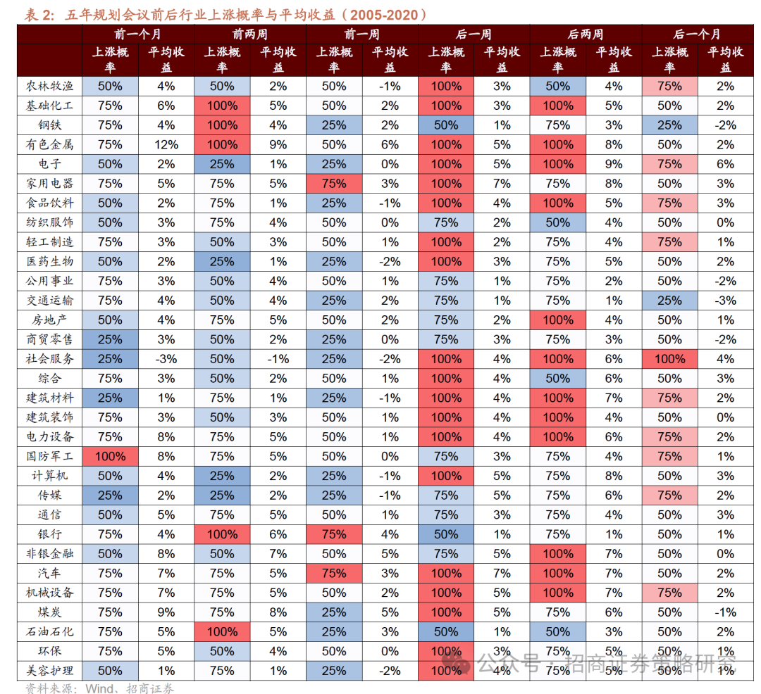 分行业来看,国防军工、有色、银行这些板块在会议前两周的表现通常较好,而会议后的一周内则普遍迎来密集的行情爆发期。所以,从短期来看,五年规划可能会给市场带来一波机遇。