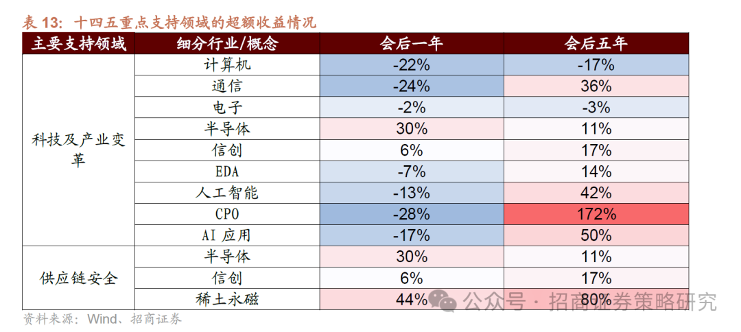 十二五继续强调“扩大消费需求”,会后一年,家用电器、食品饮料板块超额收益分别超过30%和10%。同时,规划中明确要发展战略性新兴产业,包括节能环保、新一代信息技术、新能源、新材料等,相关主题也在规划期内表现突出。