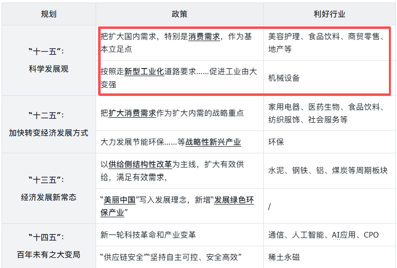 十一五规划首次提出了科学发展观,强调“把扩大国内需求作为基本立足点”,会后五年,美容护理行业相较万得全A指数的超额收益超过100%,食品饮料、商贸零售、地产这些大消费板块也普遍走强。另外,规划也指出,要“走新型工业化道路”,也推动了机械设备板块的产业升级行情。