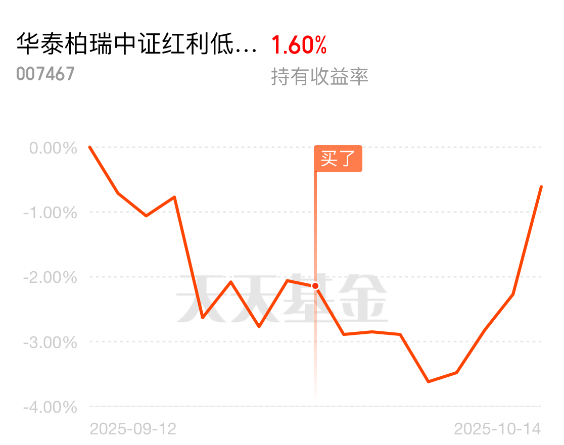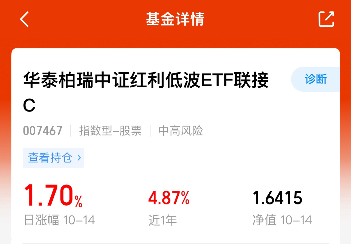 今天打开账户惊喜发现$华泰柏瑞中证红利低波ETF联接C$ 涨了1.70%,连续四天都在涨。看来四季度的季节效应真不是吹的,这种稳稳的幸福真好。#3900点得而复失!A股风格要改了?# #10月基金投资策略# #十月 你打算如何操作?#