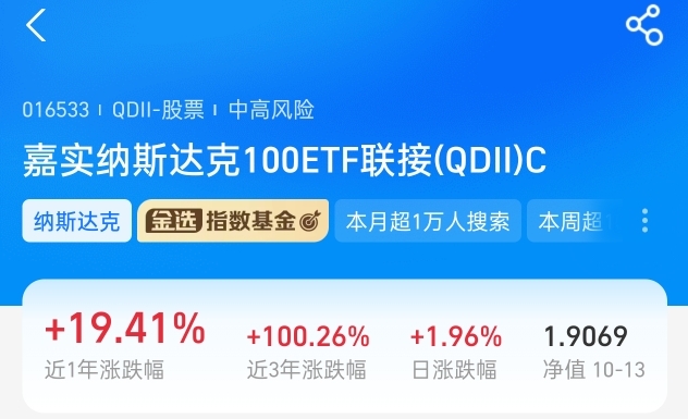 从长期维度观察,纳斯达克市场的整体走势相对平稳,展现出一定的投资稳定性。在跟踪该市场的基金中,嘉实纳斯达克100ETF发起联接(QDII)C人民币基金近期表现可圈可点,今日上涨1.96%,近一年收益率达19.41%,这样的业绩水平,相信能让多数投资者感受到踏实。