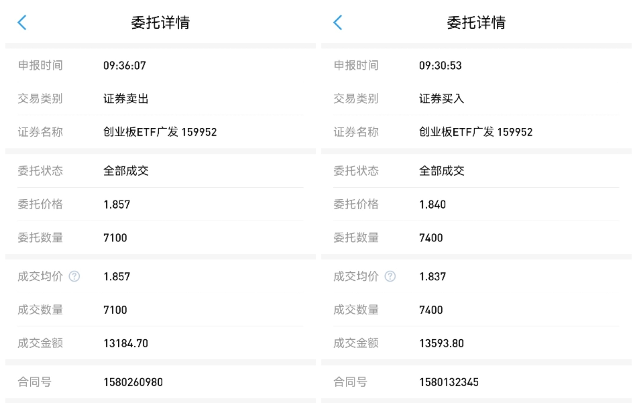 这点钱纯属过过手瘾,我每份1.837元买入,1.857元卖出,一份2分钱差价,总共挣了一百来块钱。卖出后我把1.3万还是买成同业存单指数基金,在每月还款日前,赎回来还房贷,这事不能耽误。