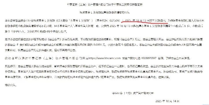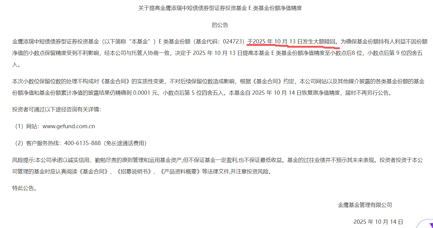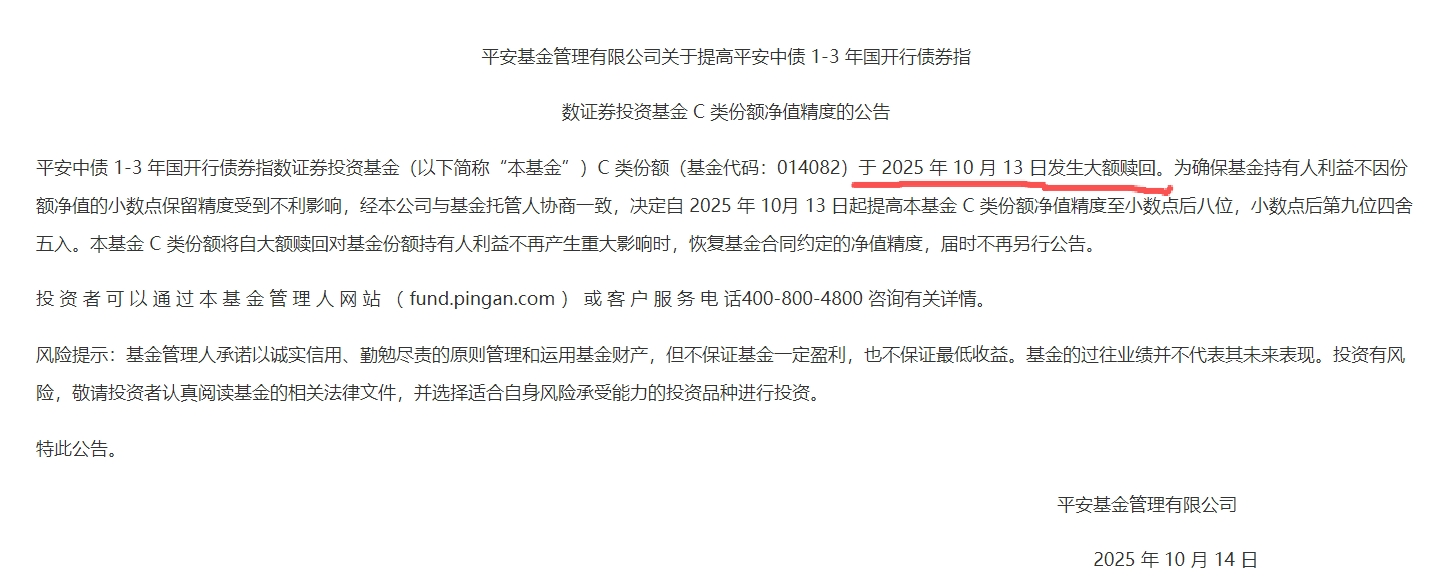 截至10月14日,平安基金、工银瑞信基金、中欧基金等12家基金管理人,因旗下债基(如平安中债1—3年国开债指数C、金鹰添瑞中短债E、华泰紫金智盈债券E等)遭遇大额赎回,密集发布提高基金净值精度的公告(多至小数点后八位),以保障持有人利益。