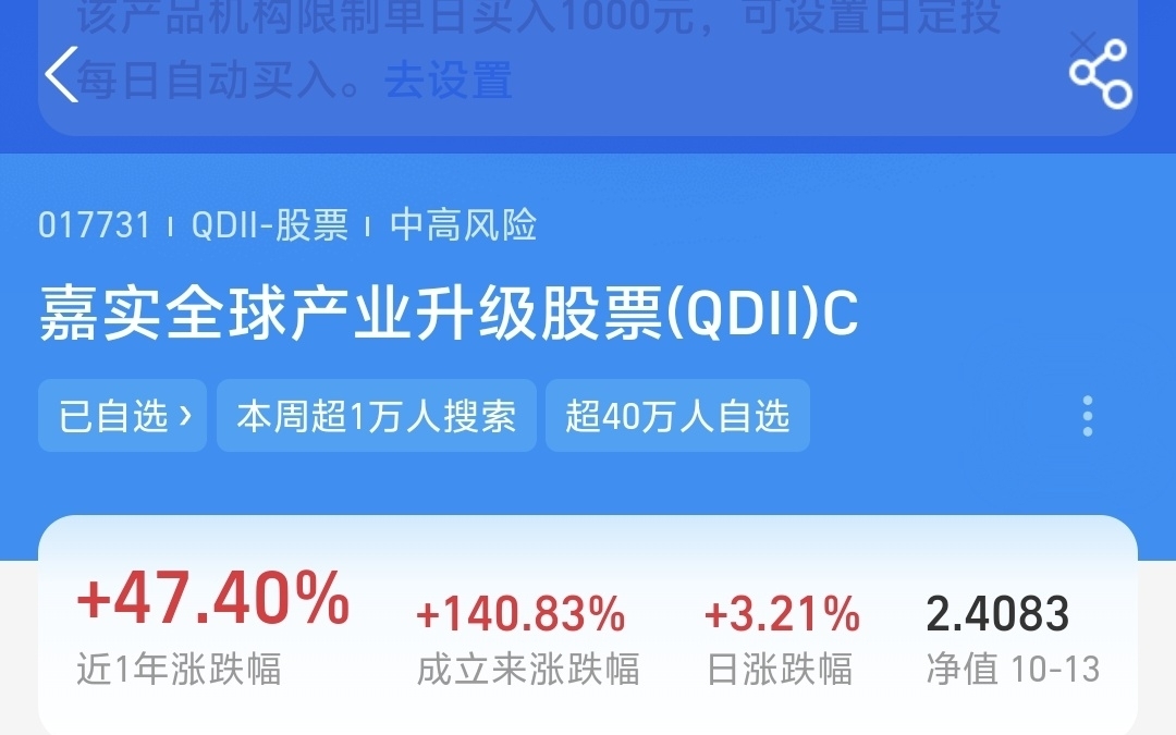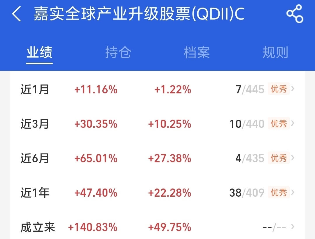 最近A股震荡,不过美股市场还是不错的。比如说我刚入手的$嘉实全球产业升级股票发起式(QDII)C$ ,看着还不错。