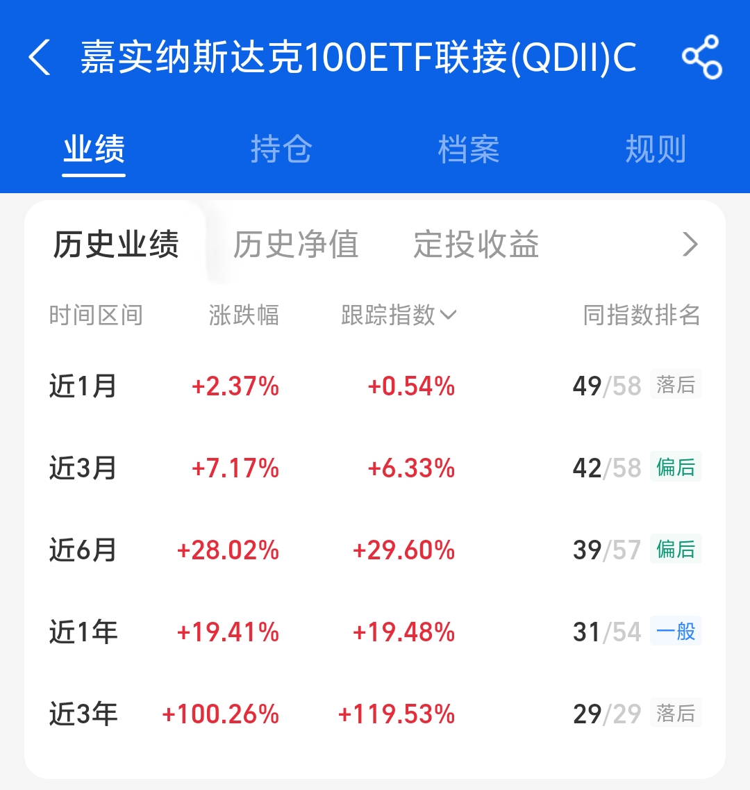 后来试着了解$嘉实纳斯达克100ETF发起联接(QDII)C人民币$ ,发现特别省心。不用自己去盯单个股票,也不用琢磨海外市场的规则,买它就能间接参与这些企业的发展。看着这些公司不断推出新技术、新产品,感觉自己也算是沾到了科技成长的边儿。