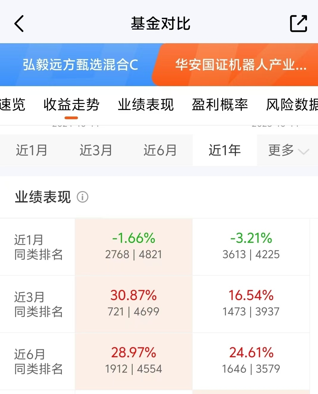 看着机器人指数三天跌超10%,风险已经放得差不多还超跌,我认为抄底时机来了。之前我提前埋伏了弘毅远方甄选混合C,它是机器人里的“黑马基”,操作比老牌灵活,近三个月暴涨39.58%爆发力超强,业绩比鹏华、永赢同类都强。现在政策、巨头都支持,我今天继续加仓。