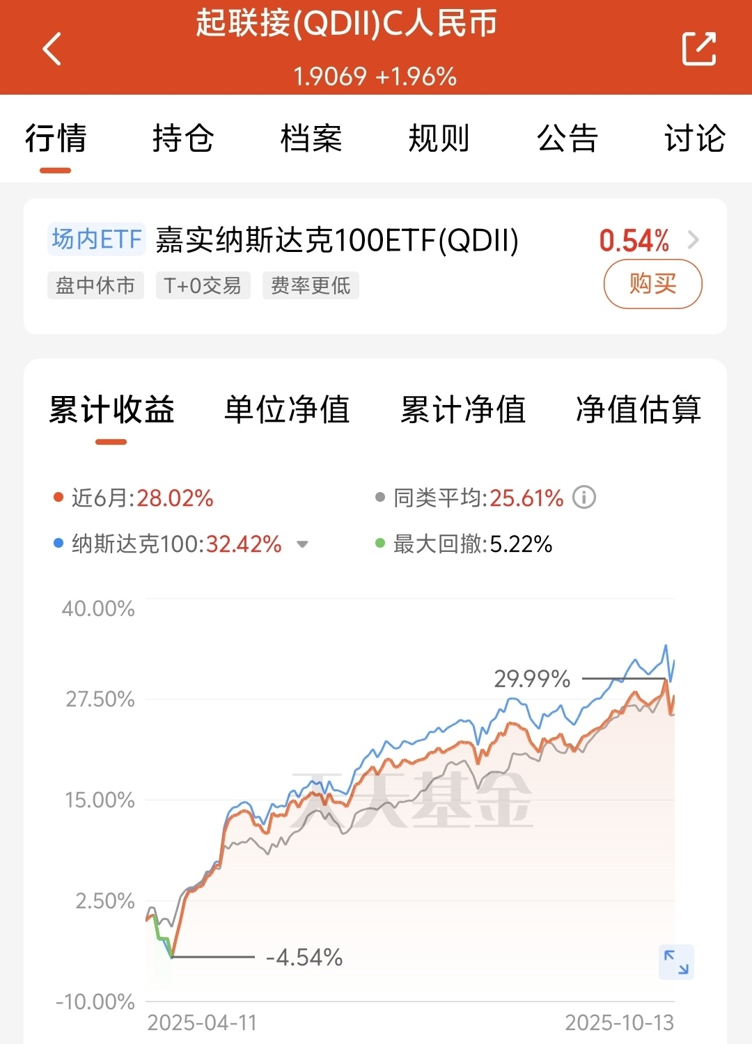 这只基金持仓含金量极高,93.40%仓位投向纳斯达克100核心标的,苹果、微软、英伟达等全球科技巨头尽数囊括,这些企业正借AI浪潮持续领跑,年内英伟达涨幅已超45%,微软也涨超30% 。近期市场调整中它展现出韧性,最新净值上涨1.96%,近六月波动上涨28.02%,紧跟指数"先跌后稳"的复苏节奏 。