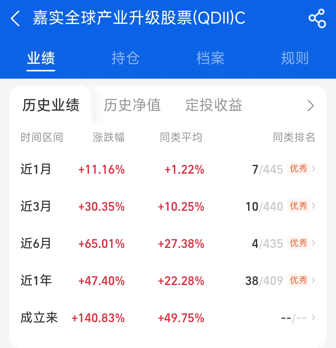 我还是继续格局我的$$嘉实全球产业升级股票发起式(QDII)C$ 最新净值涨了3.31%, 这个里面都是一些科技的方向,从短期的科技方向来说科技震荡了一波之后开始继续升温,这个搭配A股和美股的科技。英伟达、超威半导体、美光科技等全球芯片巨头,同时布局中芯国际、华虹半导体等国内核心企业,全面覆盖芯片设计、制造、存储等关键环节,全球半导体行业正处于“AI需求爆发+周期向上”的双重共振期。后期上涨还是比较乐观的。我保持不动。业绩来说近半年涨了65.01%还是不错,等待后续继续上涨!
