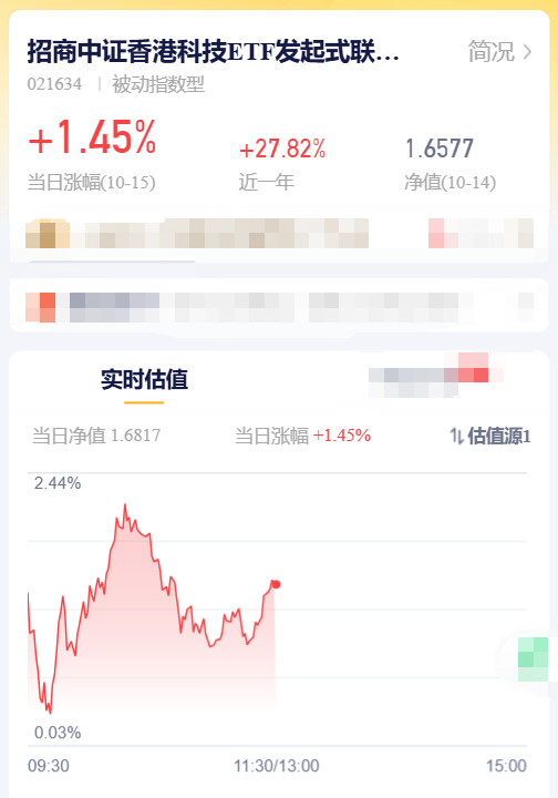 今天行情企稳回暖终于开始好起来了,我看$招商中证香港科技ETF发起式联接(QDII)C(OTCFUND|021634)$目前估值收涨1.45%,也是开始好转回暖。而且老美降息预期之下,港股流动性将进一步提升。我感觉中长期视角下,科技主线受影响的程度还是相对有限的,在市场回调过后上涨行情还是值得期待的,而且这里长线布局的优势还是挺明显的,今天行情回暖正好趁着布局咯~