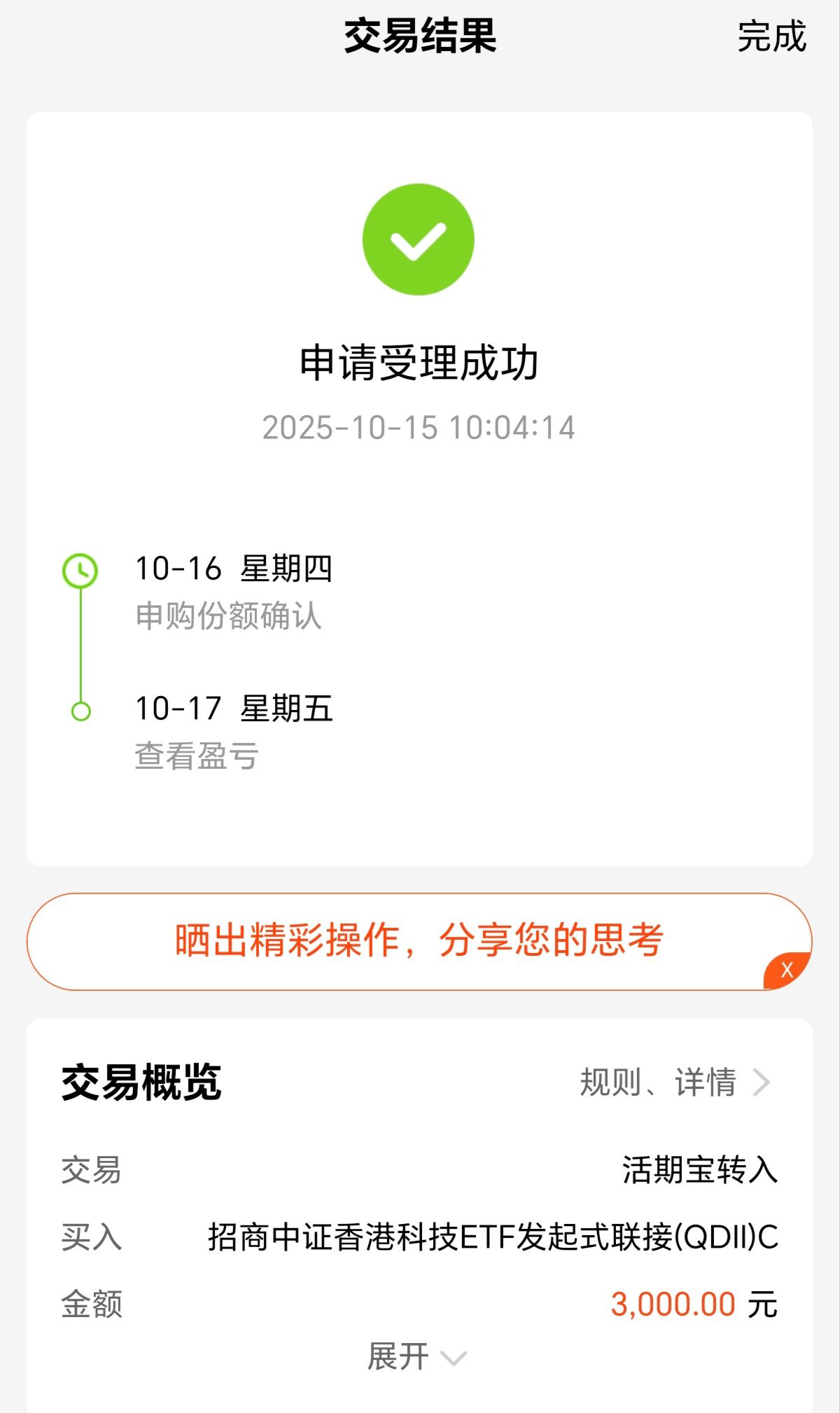 今日港股市场开启反弹企稳,科技赛道带来领涨趋势,其中我一直看好的$招商中证香港科技ETF发起式联接(QDII)C(OTCFUND|021634)$聚焦于港股科技龙头,目前实时估值大涨1.5%,前期虽有波动回调,但从中长期视角下来看,科技作为市场主线,受其影响程度有相对有限,反而在市场调整过后,仍存在结构性机会,尤其是在当前美联储降息利好下,估值修复预期也在逐步增强,所以此时的低位也会更有性价比,我也决定果断加仓起来,期待接下来的反弹收获啦!