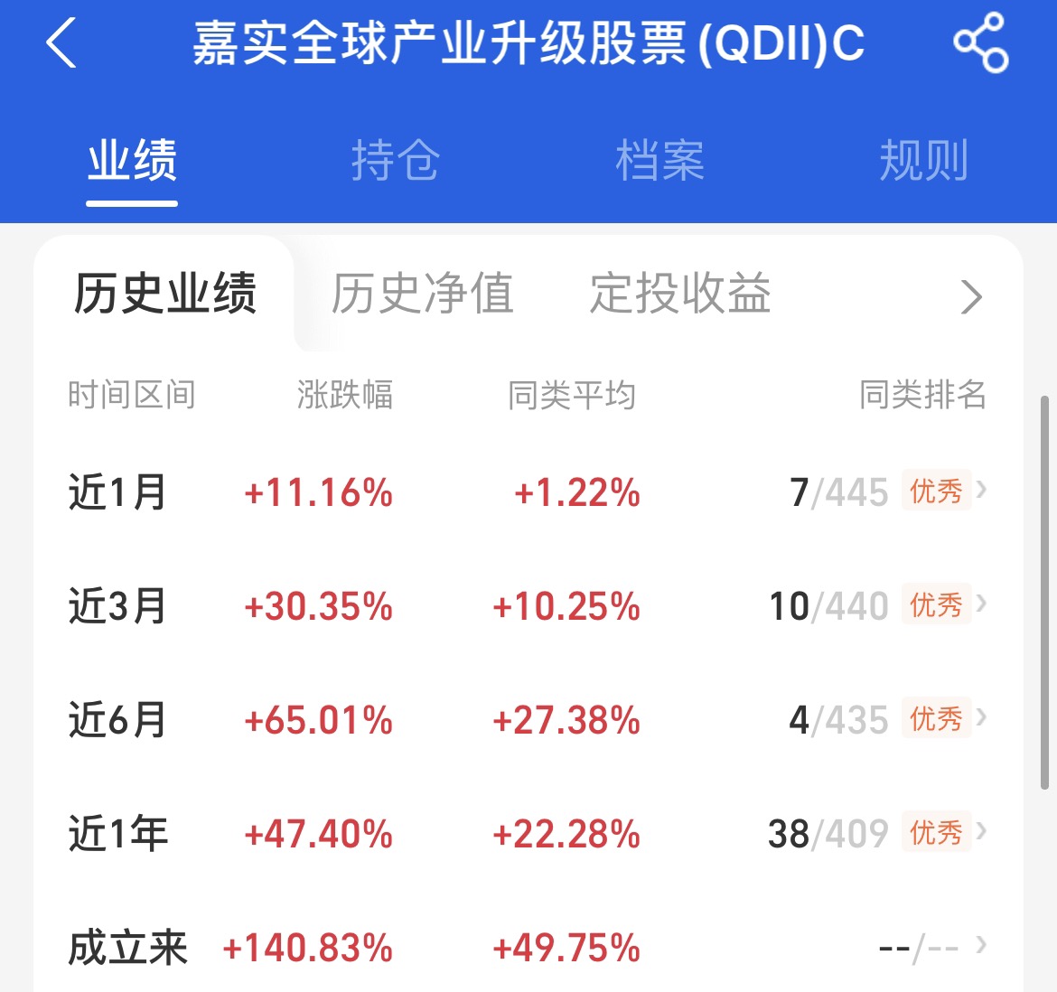 $嘉实全球产业升级股票发起式(QDII)C$ 好产品感觉后面都会到限额的道路上去,已经单日限额1000元,满足不了大多友友的投资需求了。它主要投资的是全球市场,一键布局了半导体芯片的龙头企业,涵盖英伟达、超威半导体、华虹半导体、高通、美光科技等等。近一月上涨11.16%,近半年上涨65.01%,成立来涨幅140.83%,各个维度的业绩在同类竞品中也是的。同时拥有2个经理人协同管理,深耕科技制造研究,继续关注这个宝藏好基了