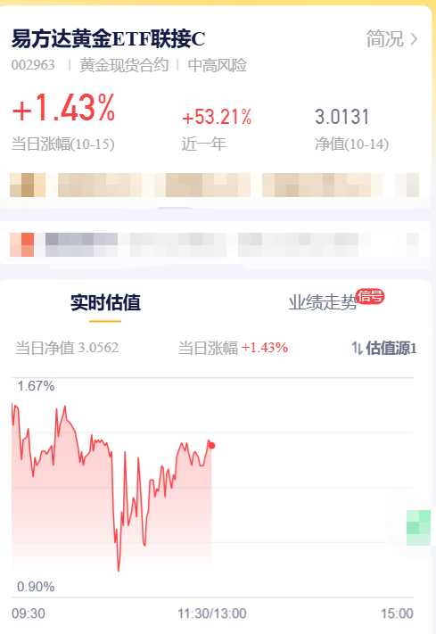 又是开开心心吃肉的一天咯~我看今天黄金股继续发力,盘中$易方达黄金ETF联接C(OTCFUND|002963)$估值收涨1.43%,这里近1周收涨7.77%,近1月收涨13.04%业绩表现还是优于同类产品的,这行情真的爱了呀~我感觉随着美联储降息+资金避险等多重利好,黄金赛道依旧处于行情的强势周期,而且做为避险资产我感觉这里也有助于风险分散,期待后续的表现哦~