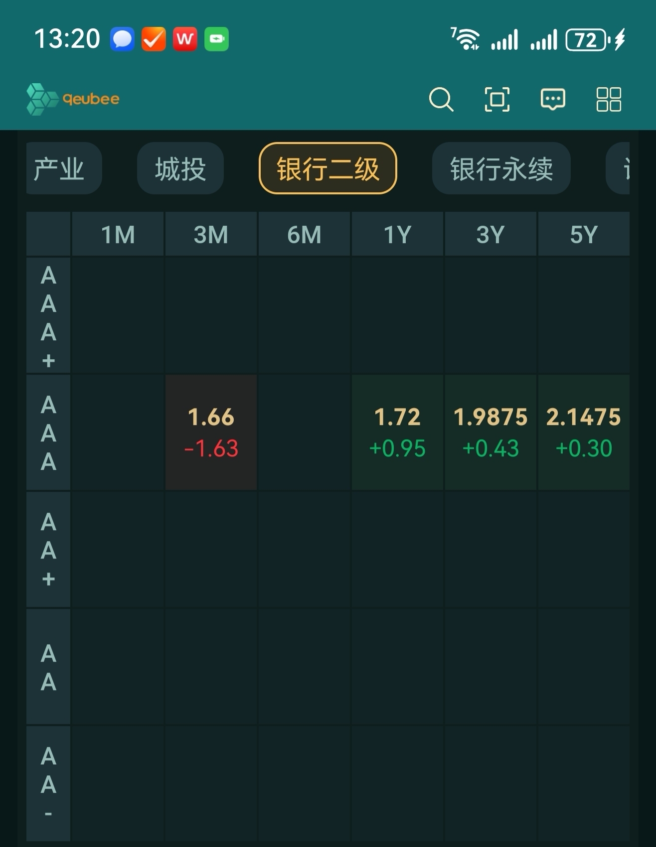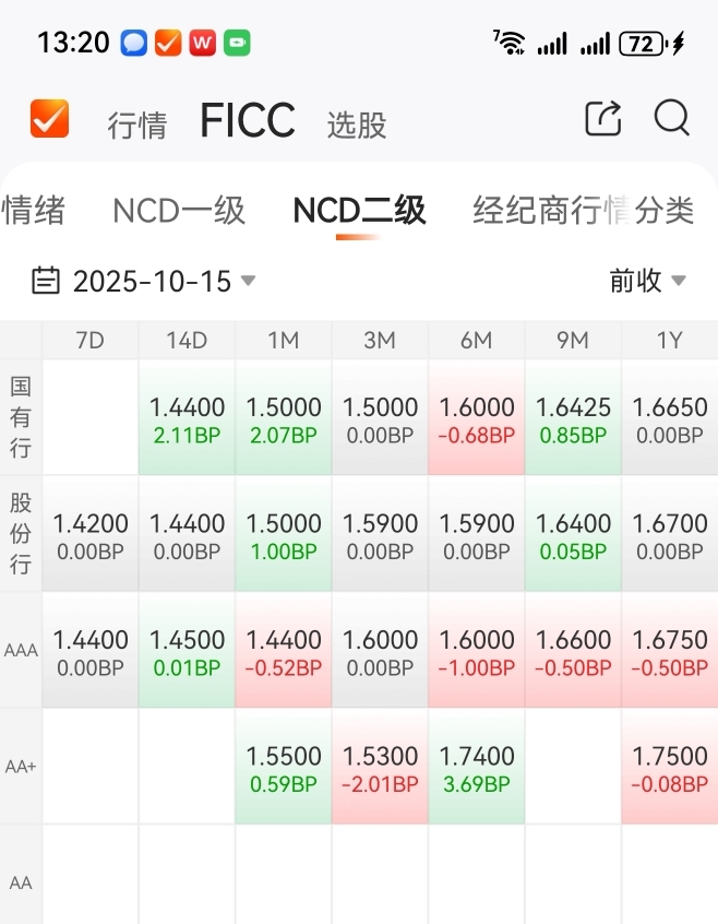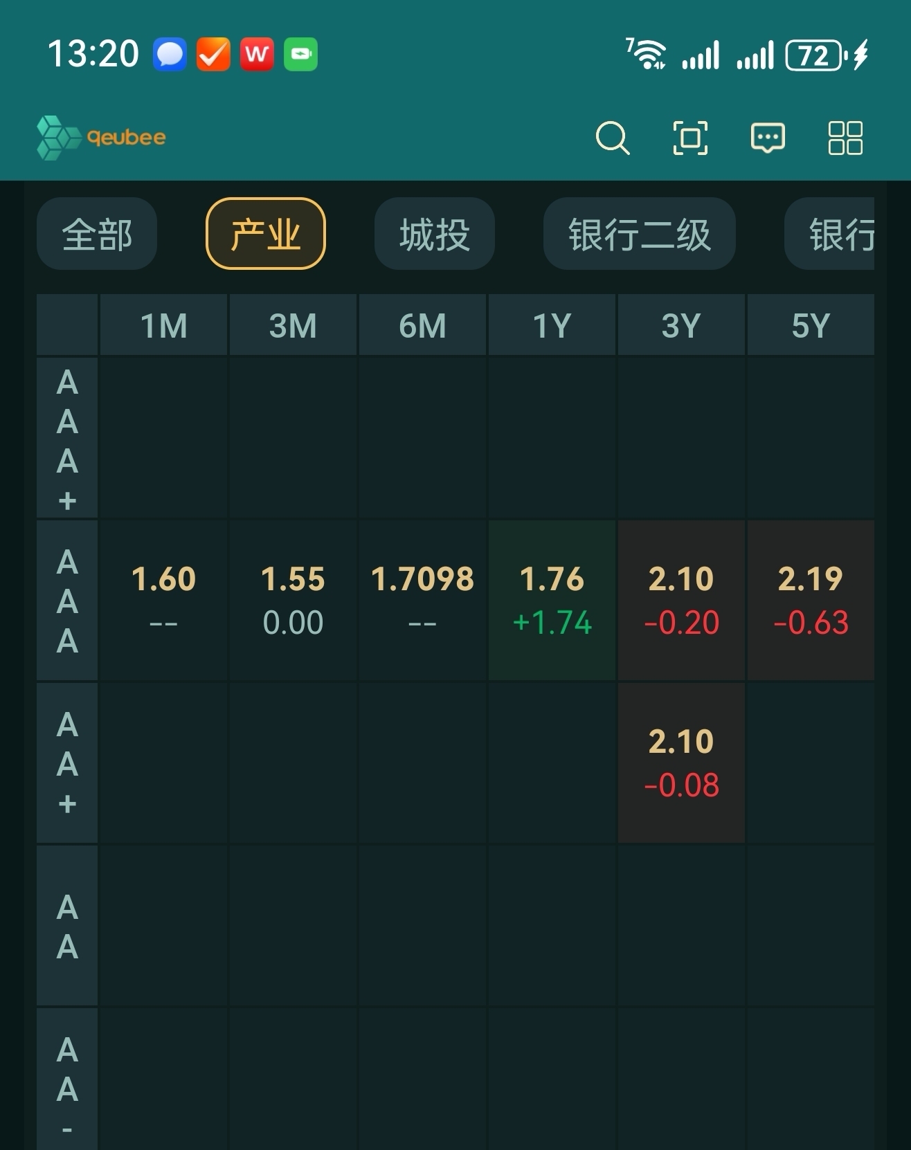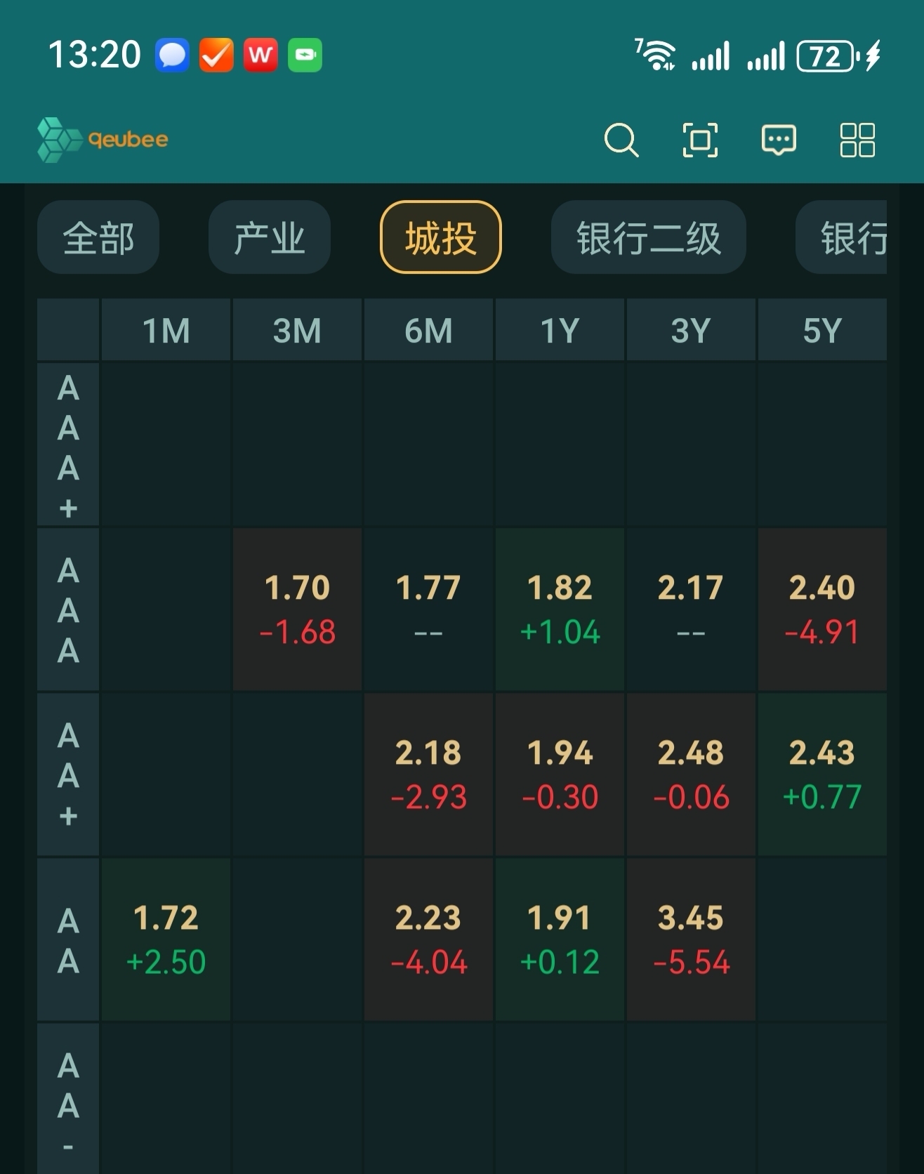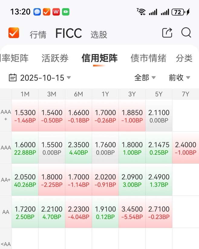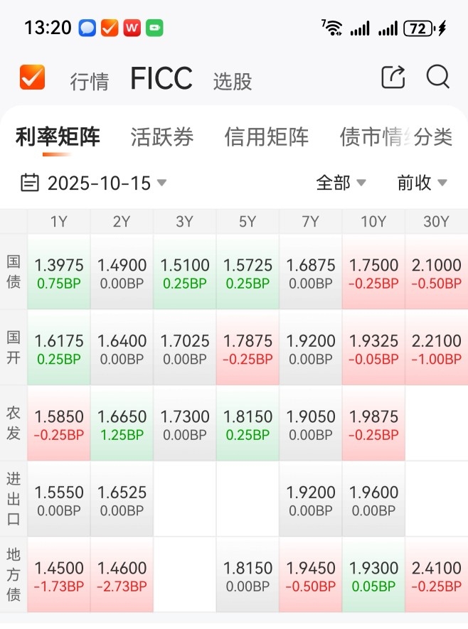 在今天下午13点20分,观察今天债市行情。红色,是涨。绿色,是跌。