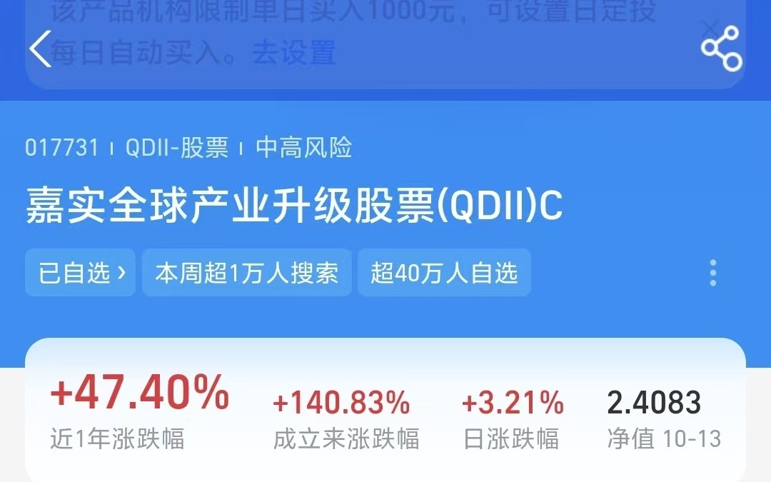 最近美股市场虽说有点震荡,但整体趋势还是稳步向上,表现挺不错的。$嘉实全球产业升